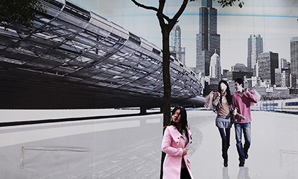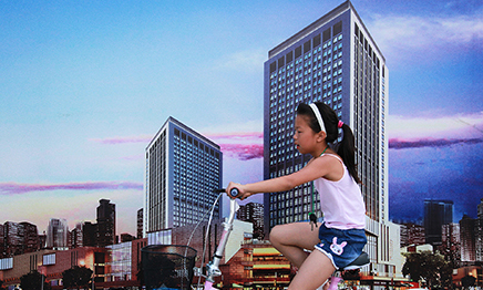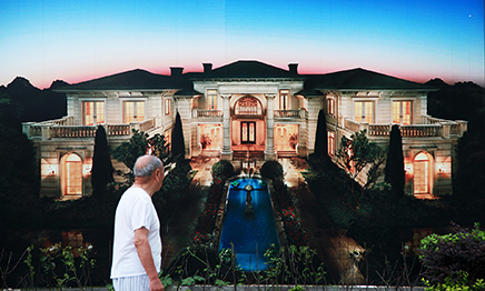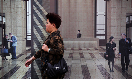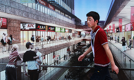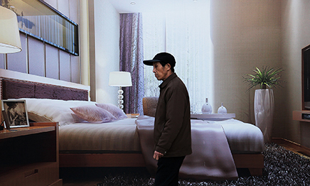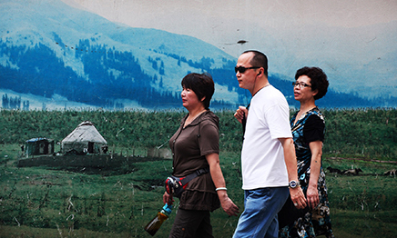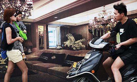 在《风景墙》里,我的基本手法是把广告牌与在广告牌前匆匆而过的行人抓拍结合于一个画面之中,我以纪实手法展现了这样的情景:镜头里真实的路人与城市中的广告风景画实现悄然融合后,“真实事件”的发生地也仿佛进行了彻底的置换。作品中涉猎到的“风景”大多与房地产开发有关,这是中国快速资本化与城市化进程的特殊语境。随着城市化进程的持续加快和商业利益的无节制膨胀,中国这片热土不仅在空间尺度上经历着巨变,人的价值观也在发生着深刻变化,物欲化的追求与攀比无休无止,对自然的索取越来越贪婪。《风景墙》里那些被大肆显摆的奢侈生活元素和以挪用绿色理念来装饰现代生活的时髦策略,揭示出城市化进程下社会价值观的变化与冲突。那些山清水秀、如梦如幻的“自然风光”镜像,让人强烈地怀念曾经熟悉的泥土芳香和清新空气,而“优雅别墅”前显得尴尬突兀的民工与普通百姓形象使人深感焦虑不安。《风景墙》似乎是在触发人们进行质疑:现代化和城市化会带给民众更多的幸福吗?