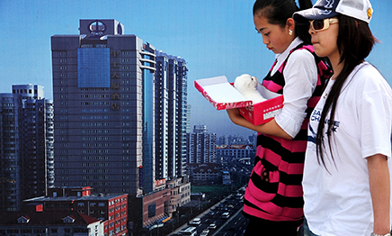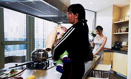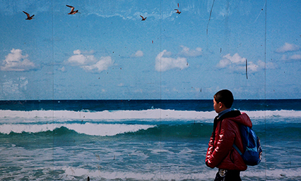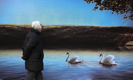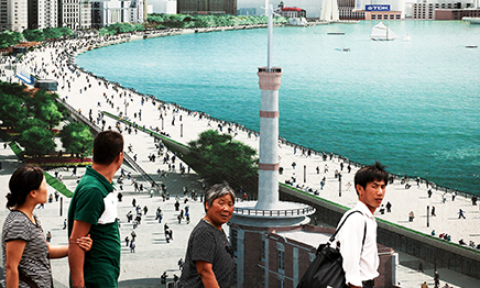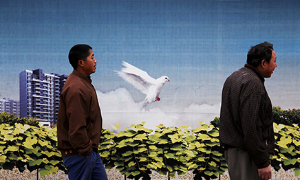 在《风景墙》里,我的基本手法是把广告牌与在广告牌前匆匆而过的行人抓拍结合于一个画面之中,我以纪实手法展现了这样的情景:镜头里真实的路人与城市中的广告风景画实现悄然融合后,“真实事件”的发生地也仿佛进行了彻底的置换。作品中涉猎到的“风景”大多与房地产开发有关,这是中国快速资本化与城市化进程的特殊语境。随着城市化进程的持续加快和商业利益的无节制膨胀,中国这片热土不仅在空间尺度上经历着巨变,人的价值观也在发生着深刻变化,物欲化的追求与攀比无休无止,对自然的索取越来越贪婪。《风景墙》里那些被大肆显摆的奢侈生活元素和以挪用绿色理念来装饰现代生活的时髦策略,揭示出城市化进程下社会价值观的变化与冲突。那些山清水秀、如梦如幻的“自然风光”镜像,让人强烈地怀念曾经熟悉的泥土芳香和清新空气,而“优雅别墅”前显得尴尬突兀的民工与普通百姓形象使人深感焦虑不安。《风景墙》似乎是在触发人们进行质疑:现代化和城市化会带给民众更多的幸福吗?